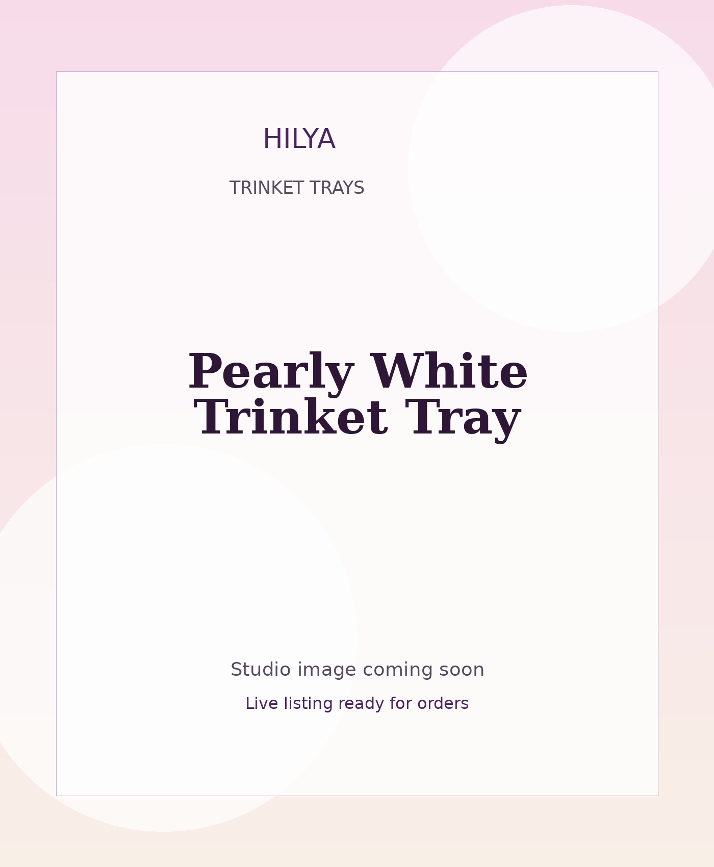 Pearly White Trinket Tray is a handcrafted resin trinket trays from Hilya. This listing currently uses placeholder imagery so the storefront stays complete while final studio photos are being prepared. The named piece, price, and ordering flow are live now, and product images can be swapped later without affecting the listing.